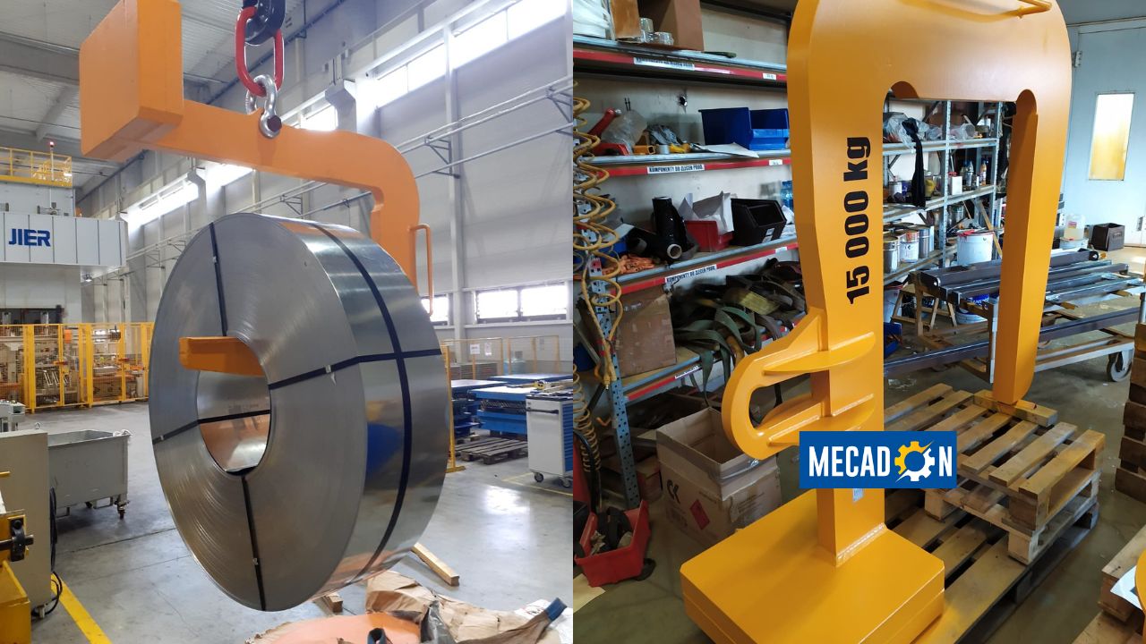 Carlig tip C utilizat pentru ridicarea și transportul pieselor cilindrice grele cum ar fi: rulouri de tablă, bobine de sârmă, rulouri de hârtie, etc.