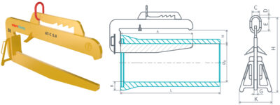 Carlig tip C pentru tuburi din beton pentru canalizare, pentru tranport in orizontala, cu sarcini nominale de 1,5t, 3,6t si 5t.