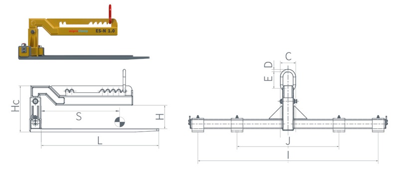 Furca macara aplatizata cu deschidere reglabila, 2 pozitii de inaltime, pentru ridicat si transportat paleti de 1000 kG.