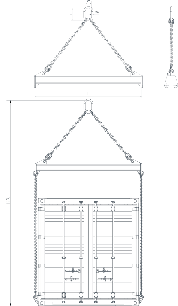 Grinda de împrăștiere pentru ridicat containere maritime, cu sarcini de 16000 kg, 24000 kg și 30500 kg.