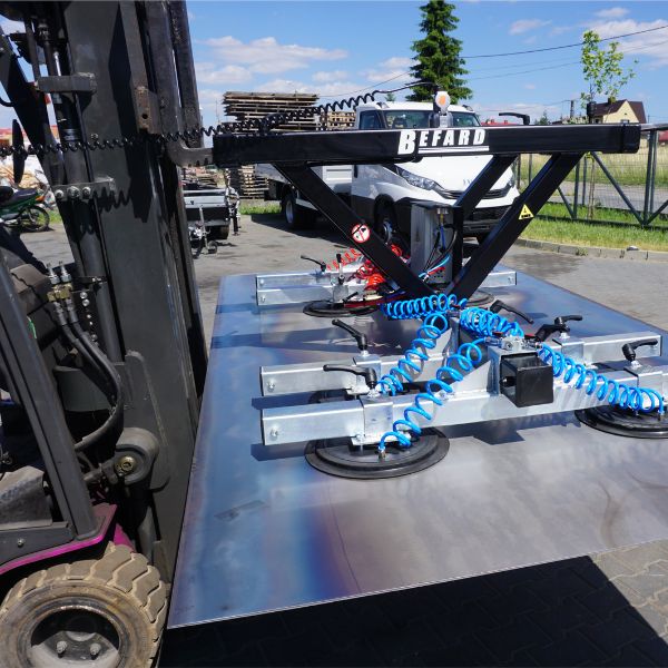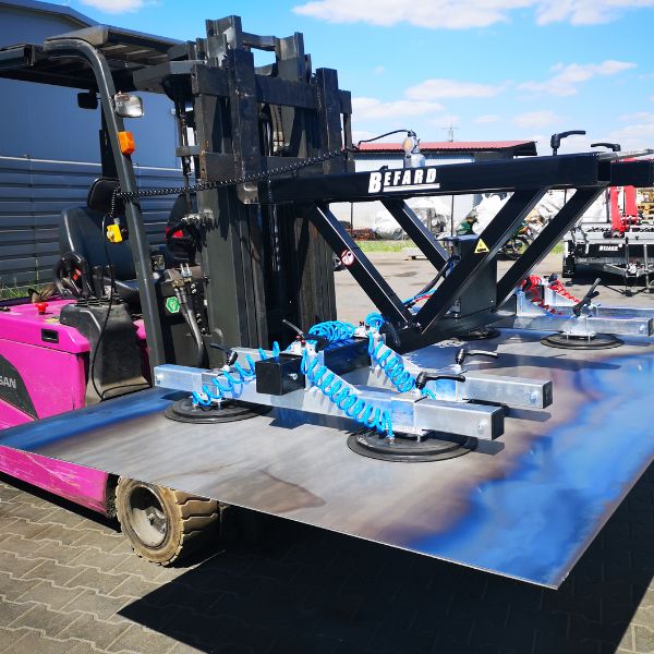Gripper cu ventuze pentru tabla, destinat utilizării cu stivuitorul.