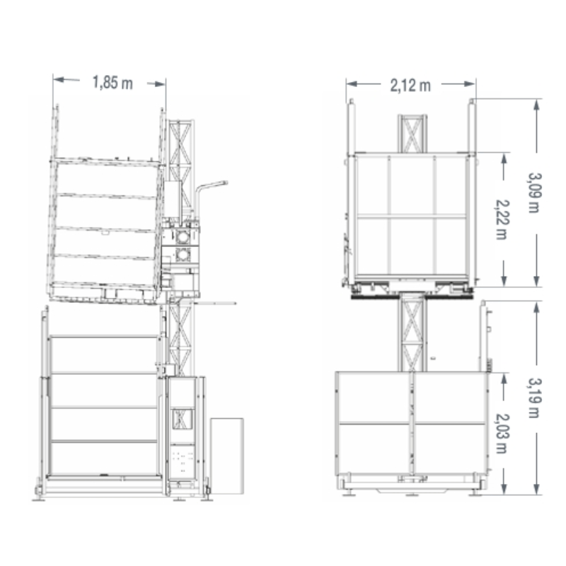 Lift șantier- 1500kg pentru ridicat atât materiale, cât și personal (maxim 14), pentru construcții edilitare, renovări și izolări fațade.