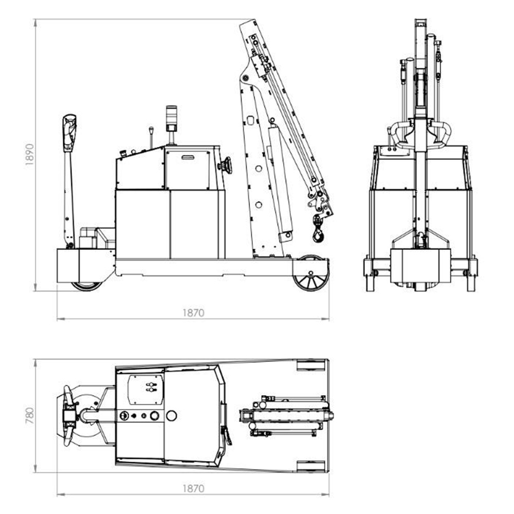 Macaraua FLEX F1000DBL este o macara pe roți acționate electric, coloană suport braț fixă, care permite ridicarea de sarcini de până la 1000 kg cu acționare electrică. Înălțimea maximă în cârlig este de 3905 mm.
