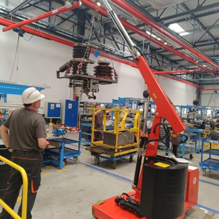 Macara mobilă, cu deplasare electrică, rotație electrică a brațului cu 220°, permite ridicarea de sarcini de până la 1000 kg cu acționarea electrică a brațului.