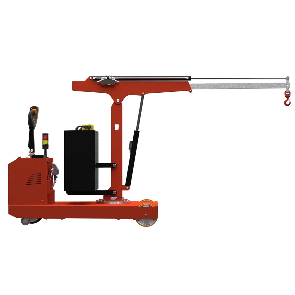 Rotația brațului, care poate fi blocată la fiecare 30°, se face manual și este facilitată de prezența rulmenților și a două mânere ergonomice situate în partea superioară a balastului/contragreutății. Este echipată cu 2 roți fixe și un motor electric de roată conectat direct la cârma pentru o manevrabilitate maximă în spații înguste.