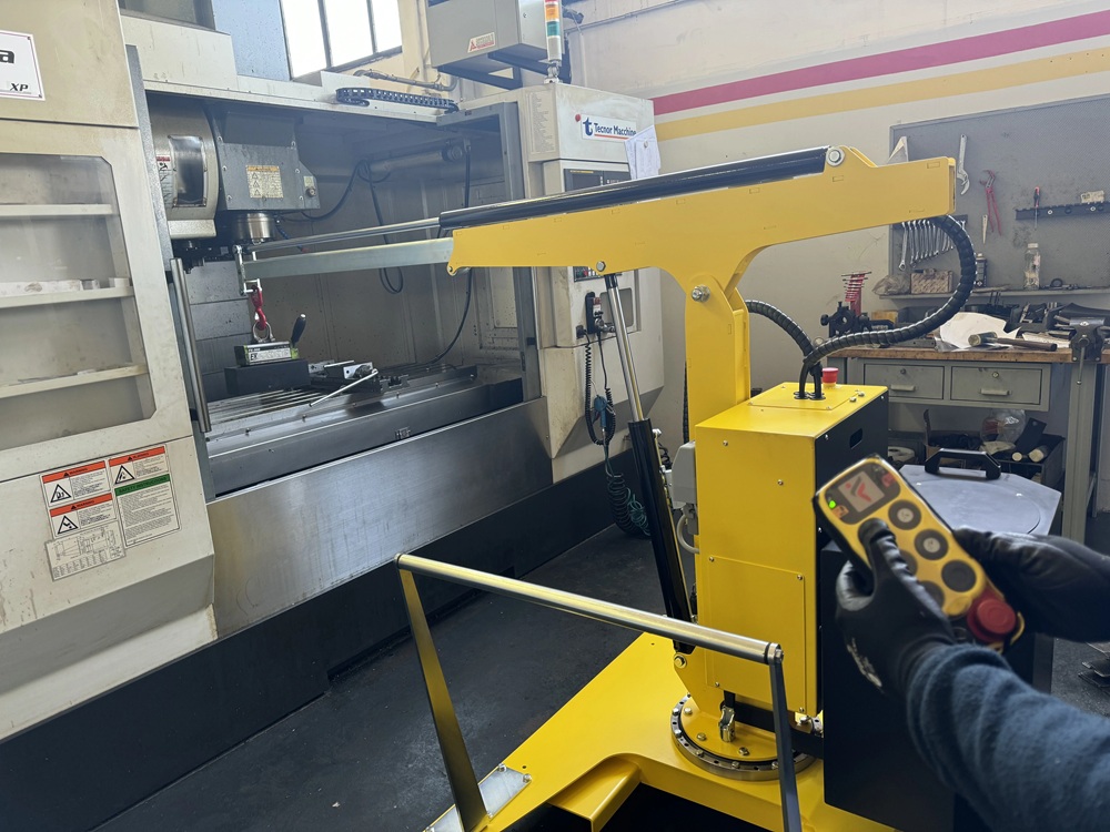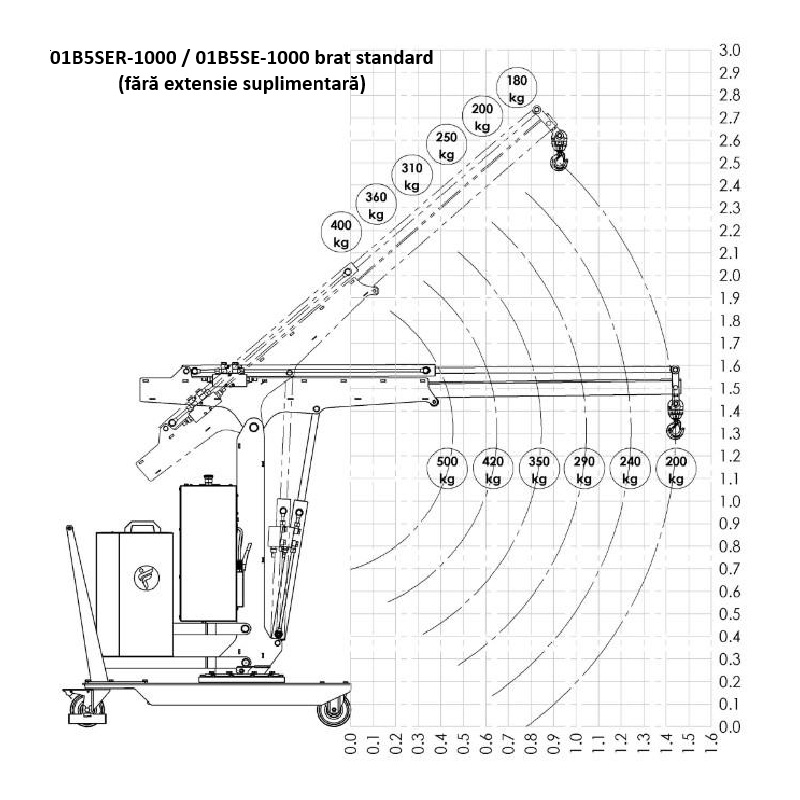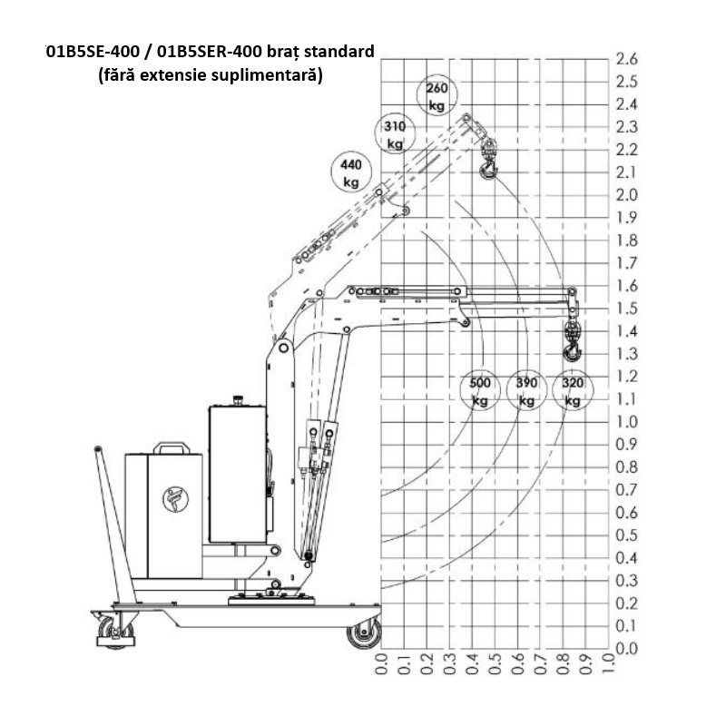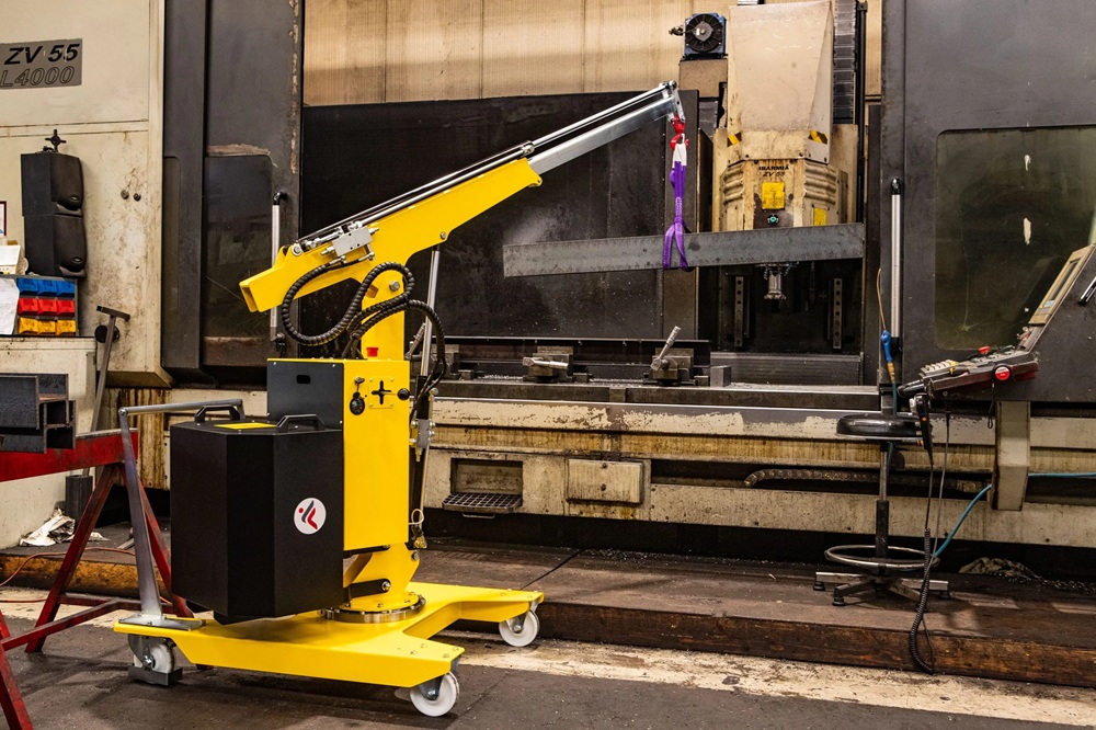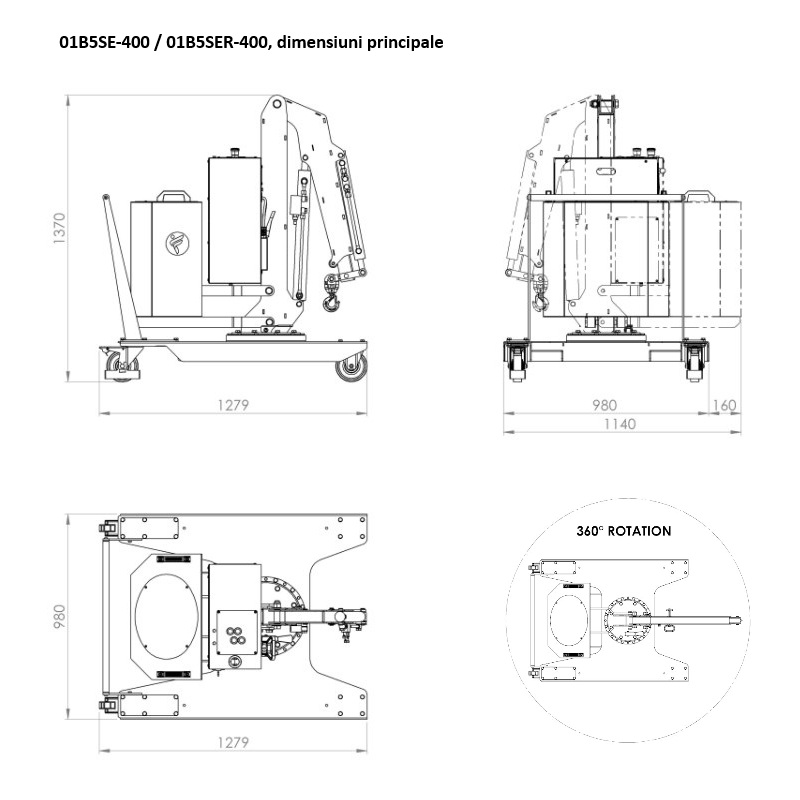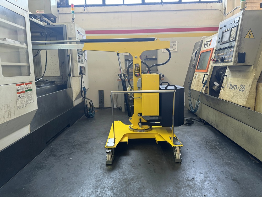 Macara rotativa contrabalansată, capacitate maximă 500 kg, inaltime maximă cu prelungitor 3 metri. Brațul este hidraulic, comandat electric are o cursă de 400 sau 800mm.