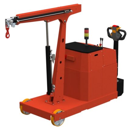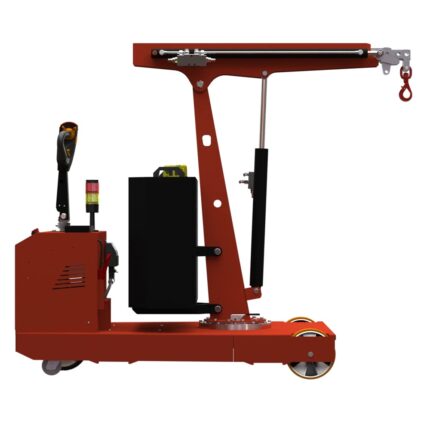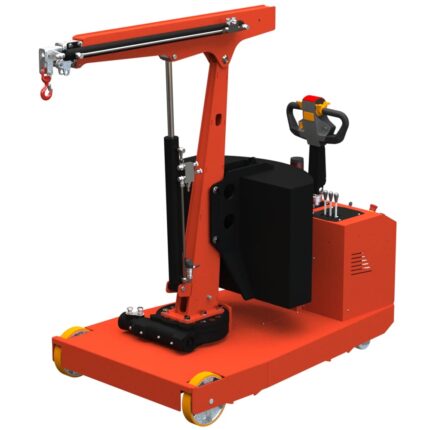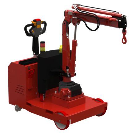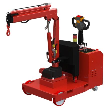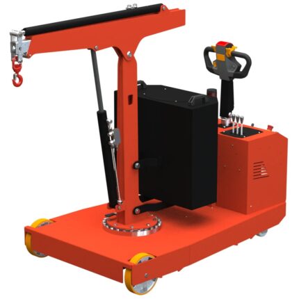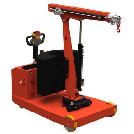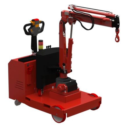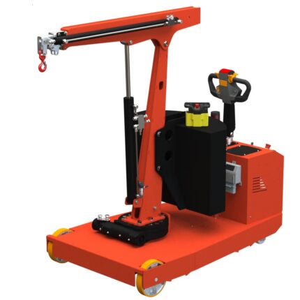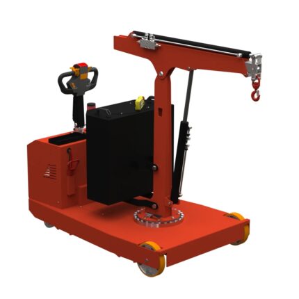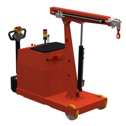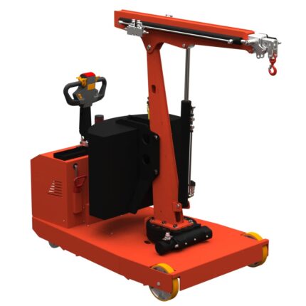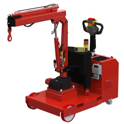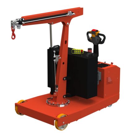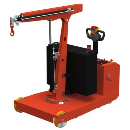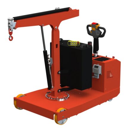 Macara mobilă, cu deplasare electrică, rotație electrică a brațului cu 220°, permite ridicarea de sarcini de până la 1000 kg cu acționarea electrică a brațului, cu telecomanda.